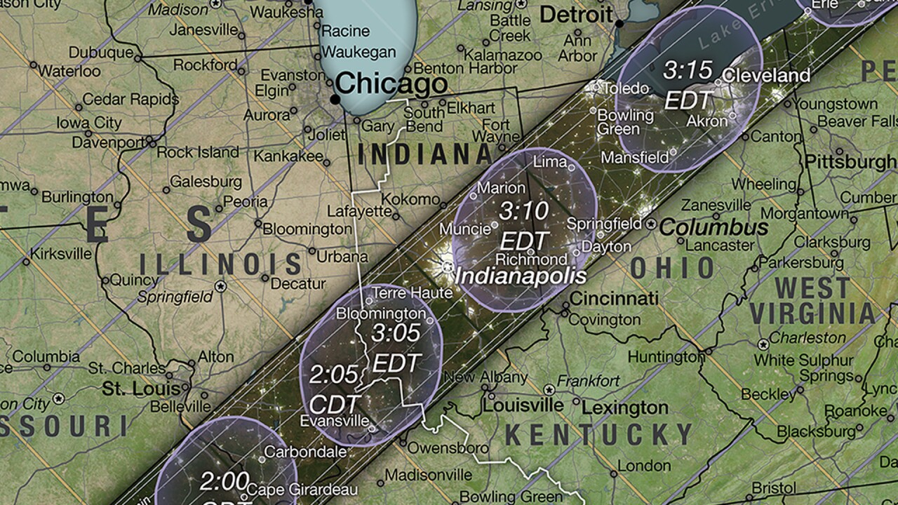 Indiana Eclipse Map – “Get a few miles in to guarantee at least 10 to 30 seconds of the totality,” which the new eclipse map shows has shifted further away from Indiana cities like Kokomo, Frankfort, Crawfordsville and . With the total solar eclipse approaching and Indiana being prime real estate for sky-watching, police are anticipating packed roads and heavy traffic conditions. โWe’ve likened it to having the .