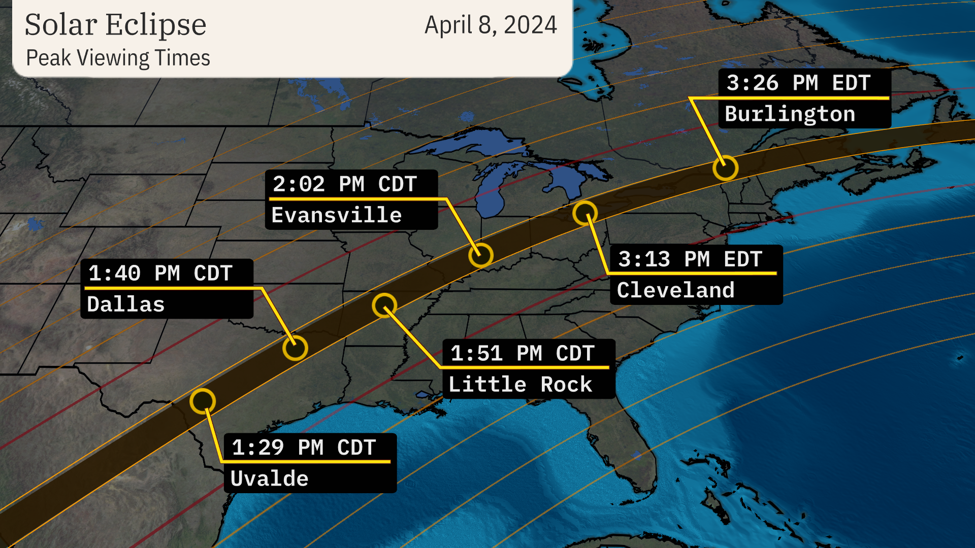 Solar eclipse maps show 2024 totality path, peak times across the U.S.